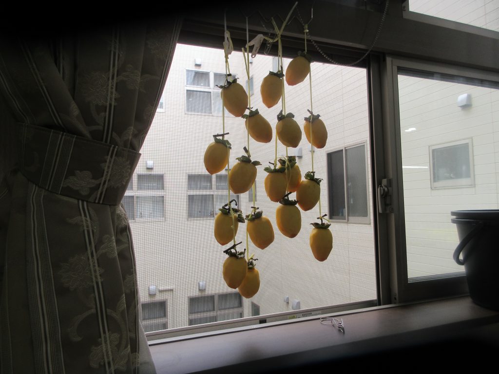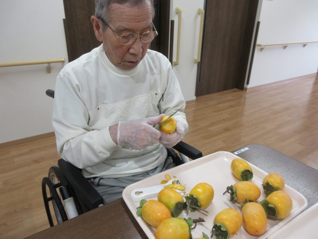 「柿、よかったら要りますか?」と声をかけてくれた職員さん。おばあちゃんの家の柿の木に沢山なっていて、くださるというので急きょ干し柿作りを行いました。