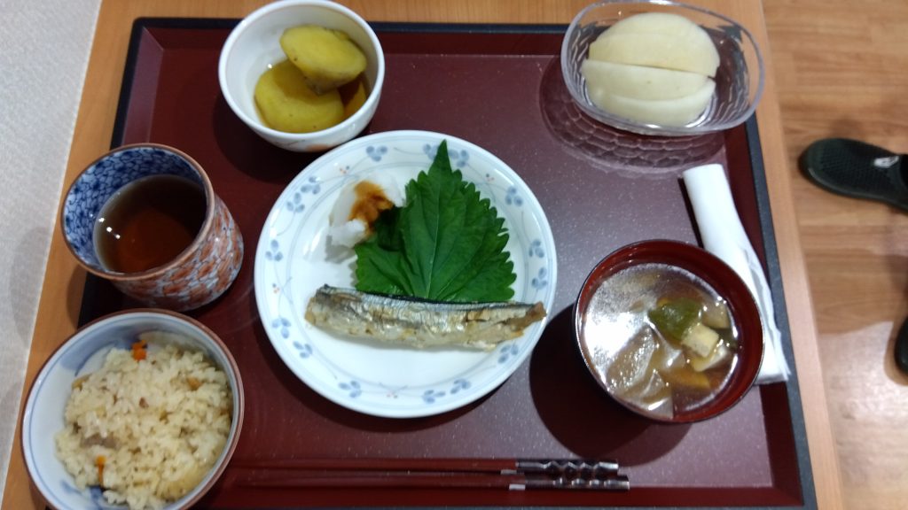 メニューは「炊き込みご飯・サンマの塩焼き・さつま芋の煮物・けんちん汁・梨」にしました。